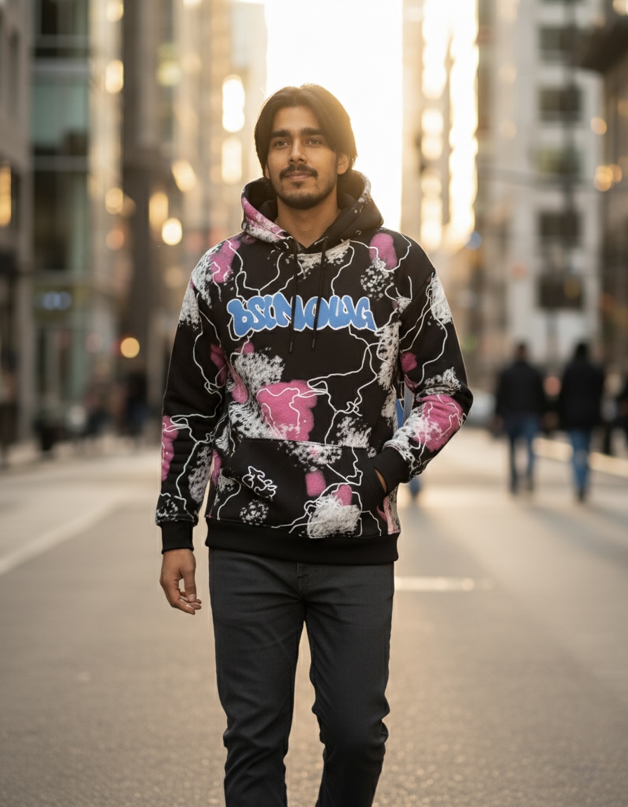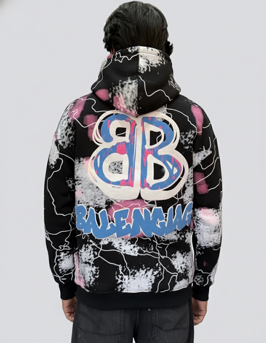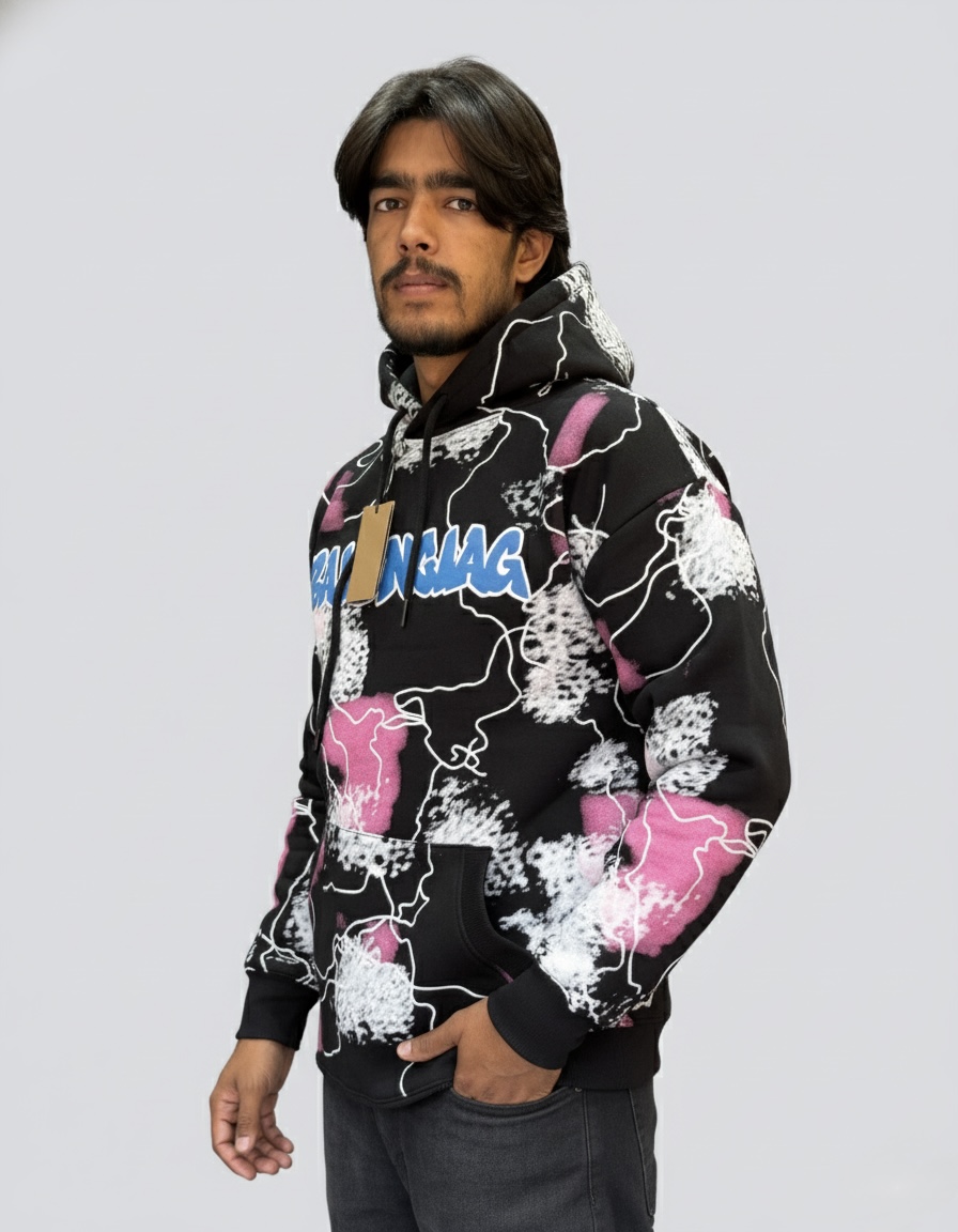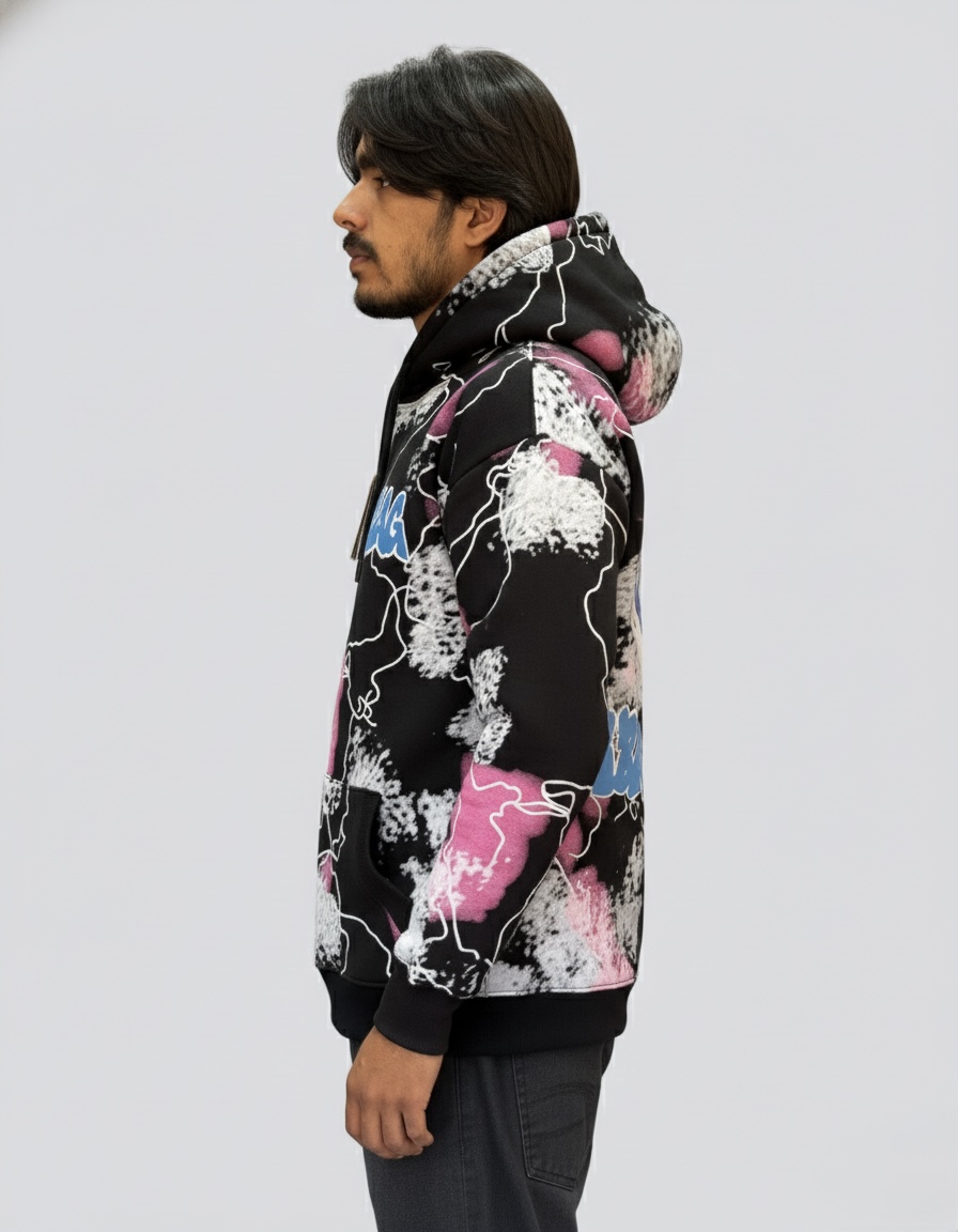 • Dynamic All-Over Print: Eye-catching black hoodie with an abstract “paint splatter” and graffiti-style design.