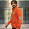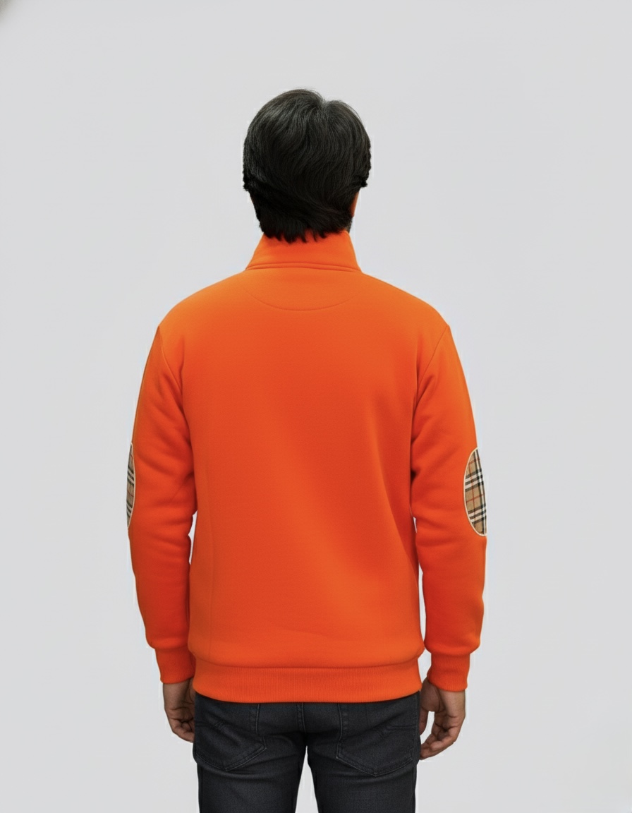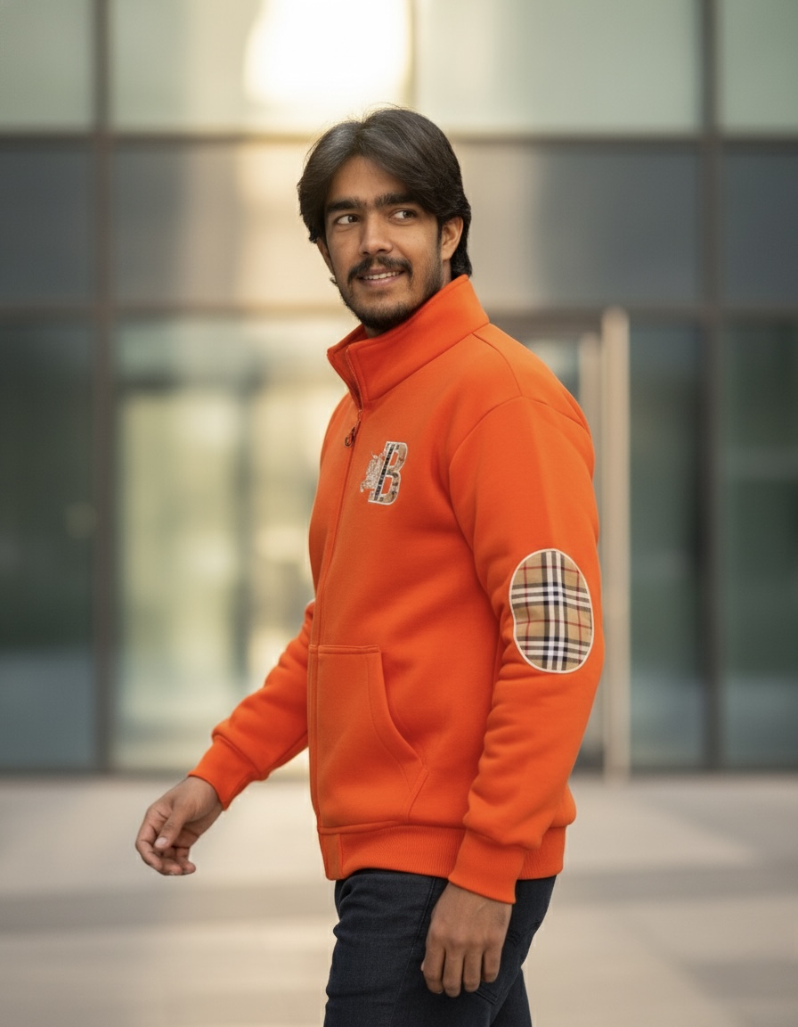 Men’s Stylish Orange Zip-Up Jacket | Premium Cotton Fleece | Burberrys Pattern Elbow Patch | Trendy Winter Wear | Casual Bomber Zipper